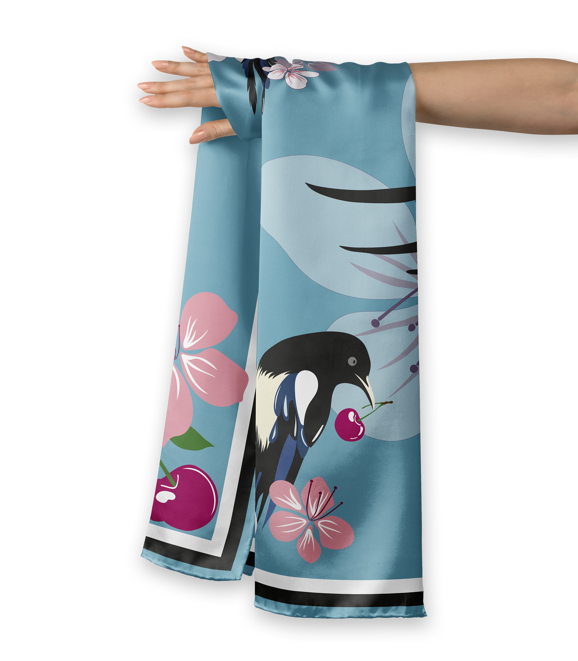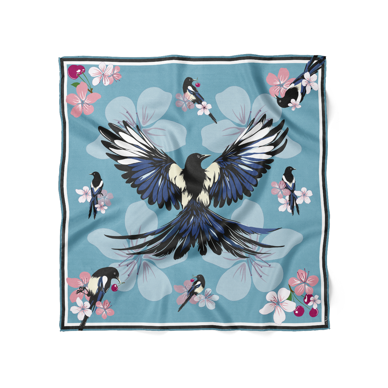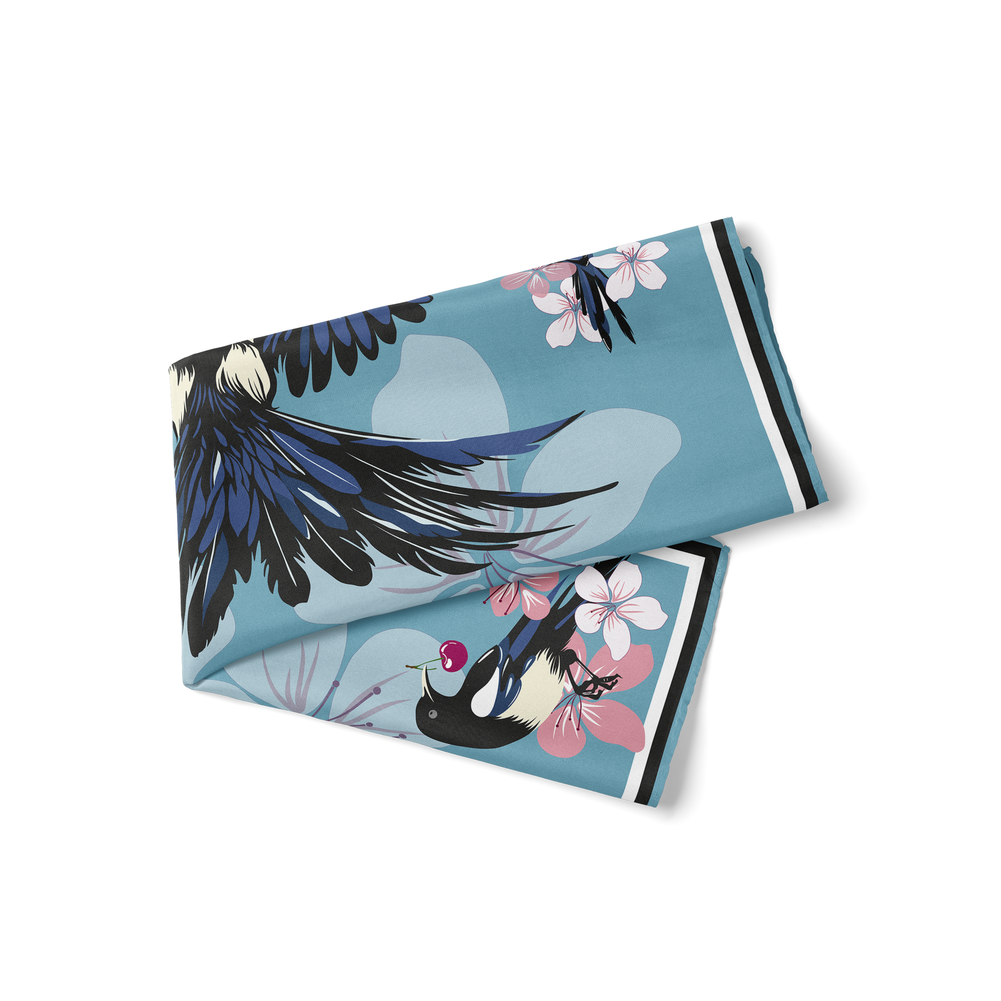Designet på dette tørklæde fanger denne dualitet: harmonien mellem modsætninger og fascinationen af det ekstraordinære. Ligesom skjærene, der lærer os at se verden fra forskellige perspektiver, inviterer dette tørklæde dig til at bære et kunstværk, der ikke kun fortæller en historie, men også opfordrer dig til at opdage undren i det hverdagslige, det skinnende og det unikke.